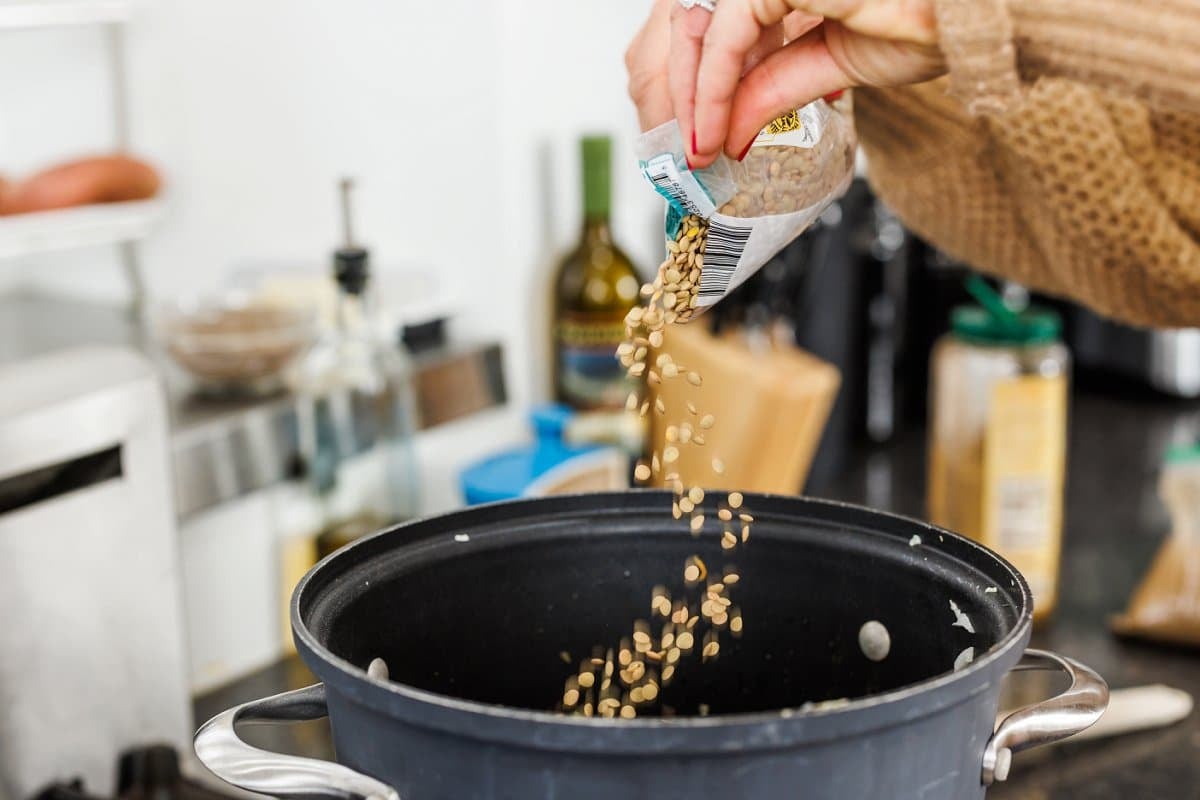 Then you’ll add the dried lentils to the pot, and sauté an additional couple minutes.