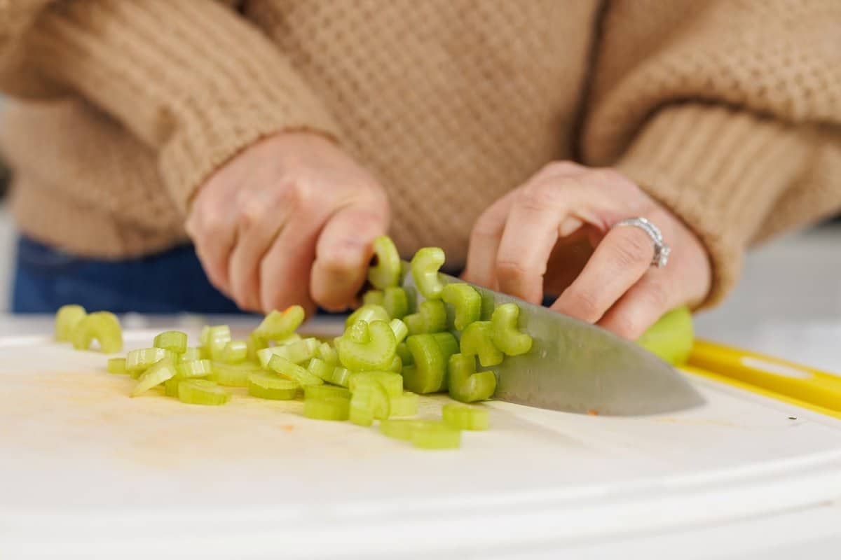 Start your soup by preparing your ingredients, including washing and chopping your celery, carrots, and onion.