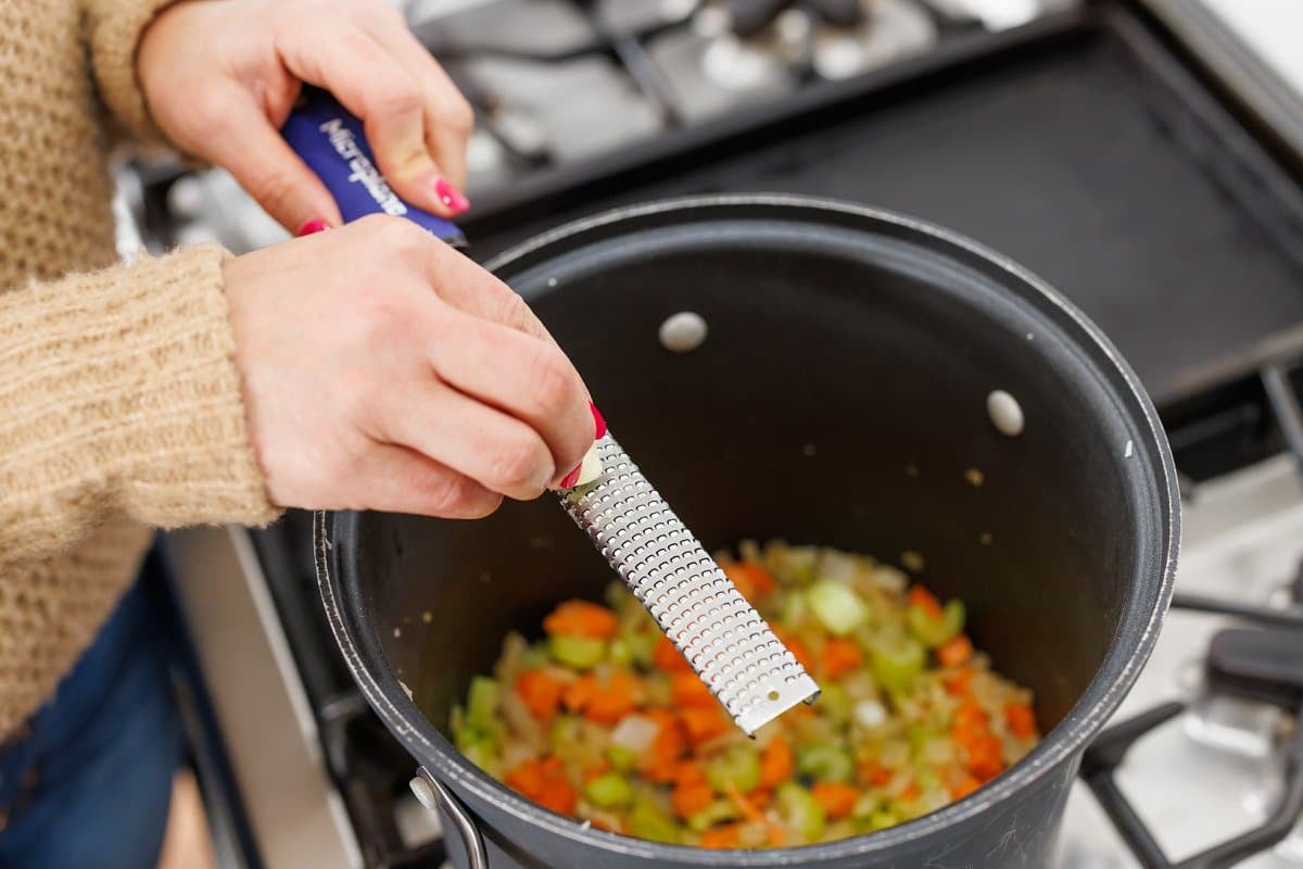 You can mince your garlic, or use a microplane to grate it straight into the pot. Cook until aromatic.