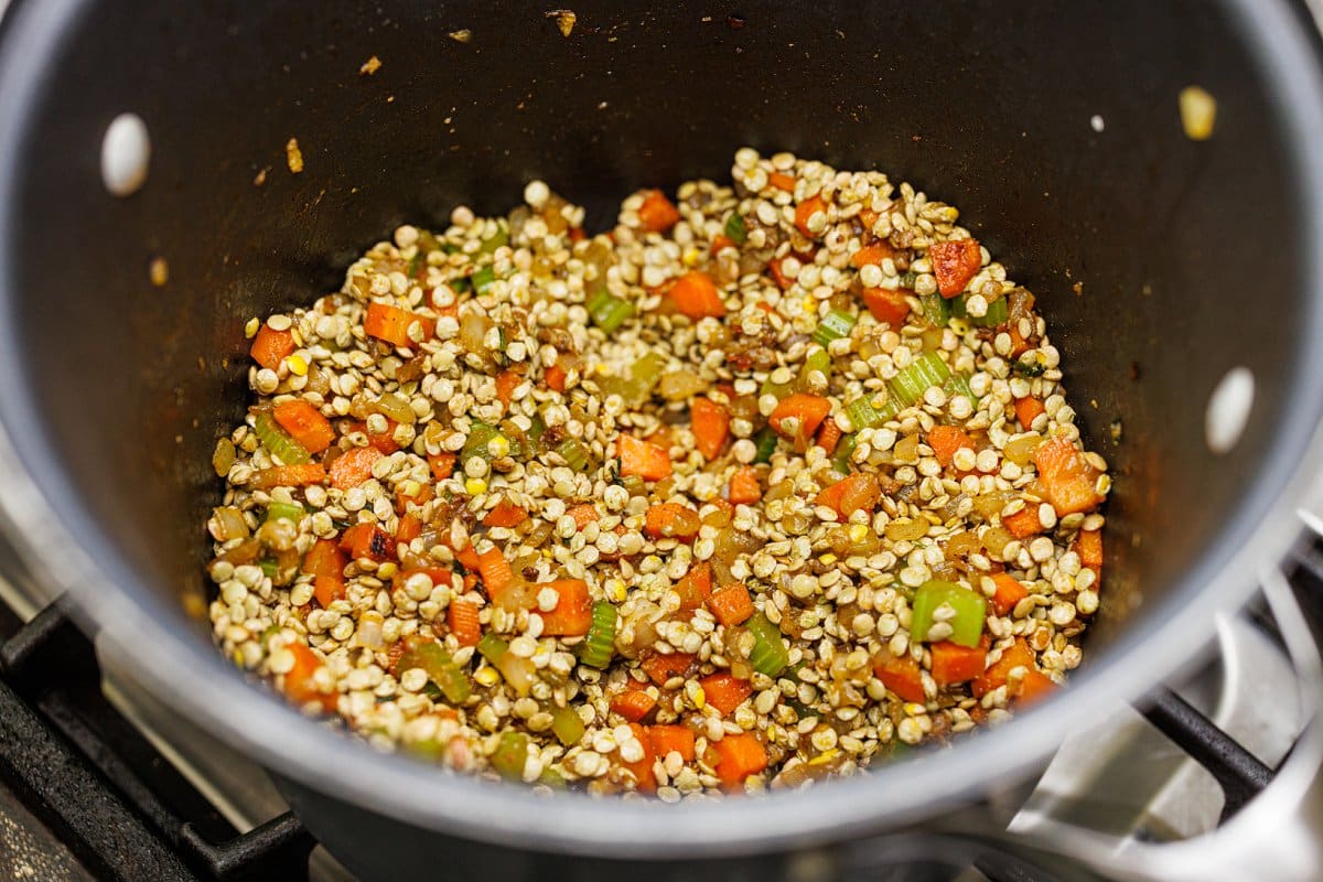 Step 4. Once veggies are tender, add the rinsed and sorted lentils.
