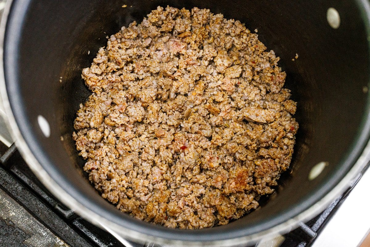 Step 2. In the bottom of a large pot, remove your sausage from the casings and cook until browned. Then remove and set aside.