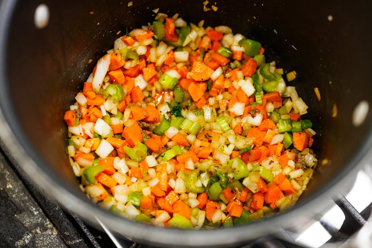 4. Using sausage drippings, saute onions, carrots and celery until soft about 7 minutes.