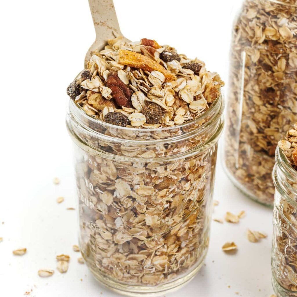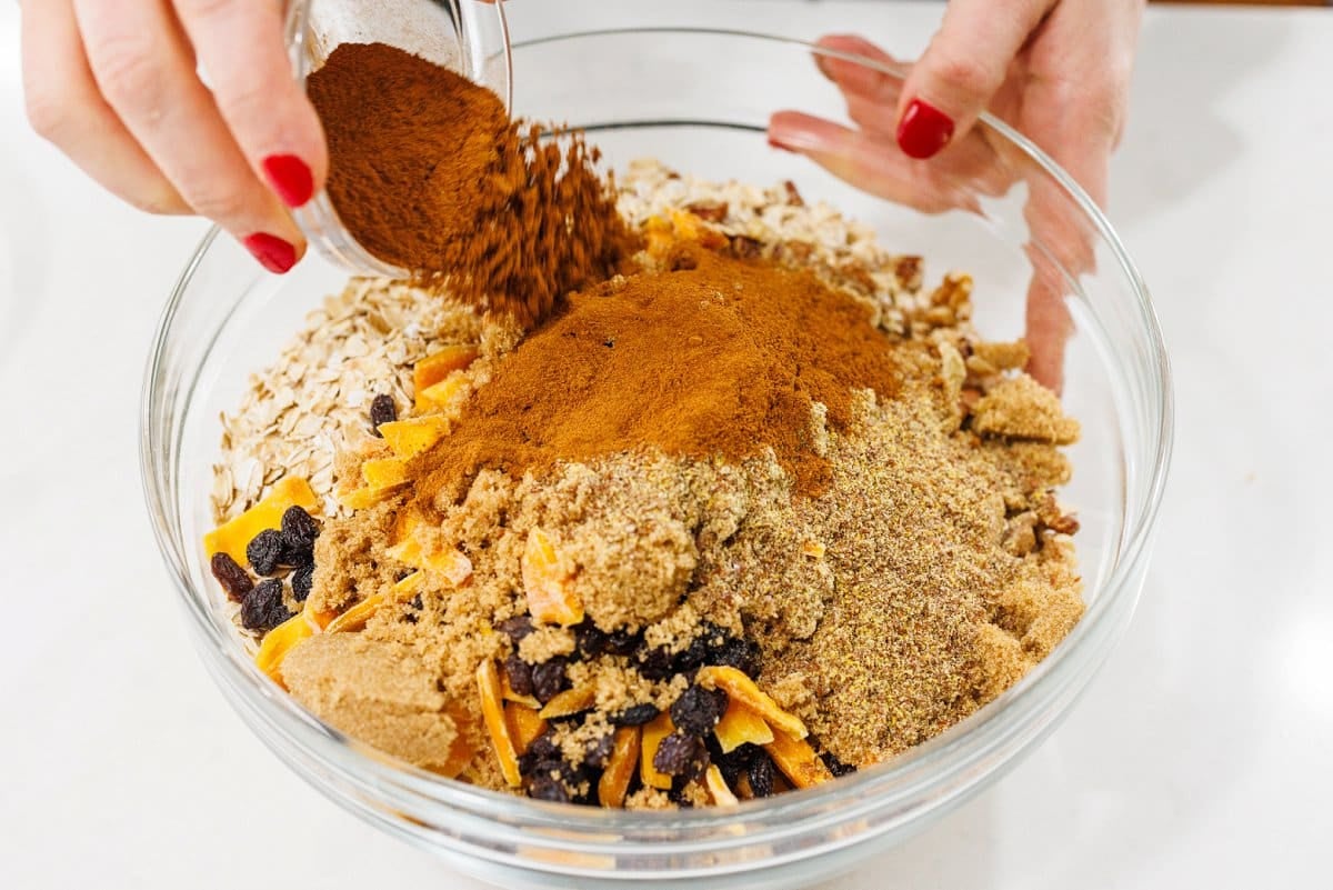 - In a large mixing bowl, combine all ingredients including toasted nuts. Store in an air-tight container for up to 3 weeks.8 cups old fashioned oats, 2 cups dried fruit, 1/2 cup brown sugar, 1/4 cup flax seed meal, 3 tablespoons cinnamon, 1 tablespoon salt, 1/2 tablespoon nutmeg, 1/4 tablespoon ground cloves