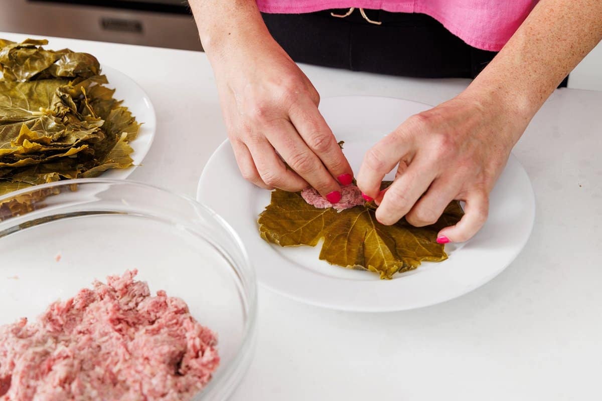 - One grape leaf at a time, place the leaf flat on a plate and add 1 tablespoon of meat and rice mixture near stem.