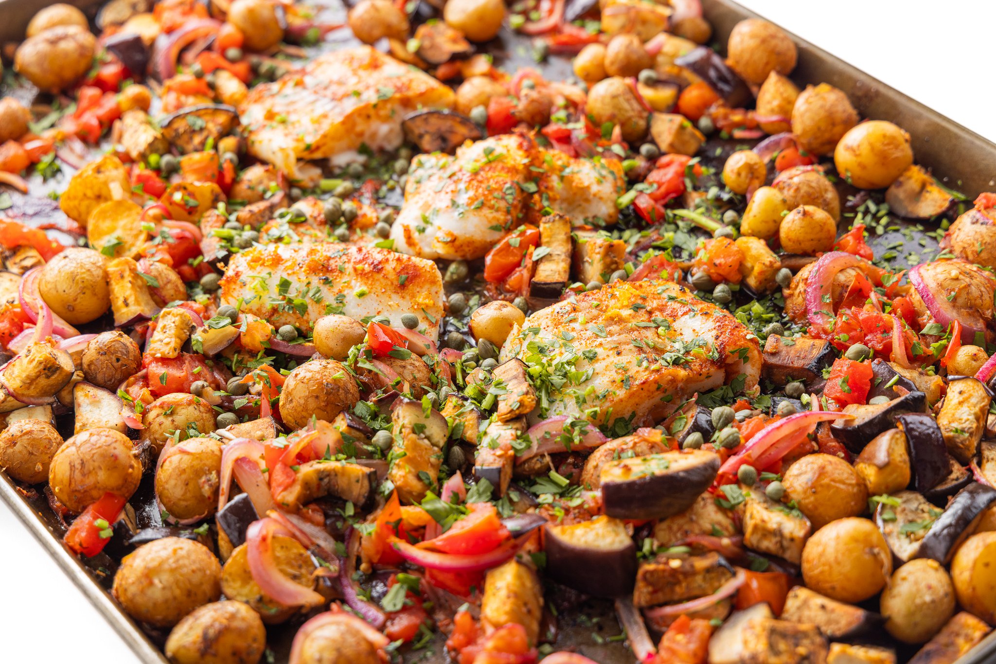 How to Make Mediterranean Baked White Fish with Potatoes, Eggplant, and Tomatoes
