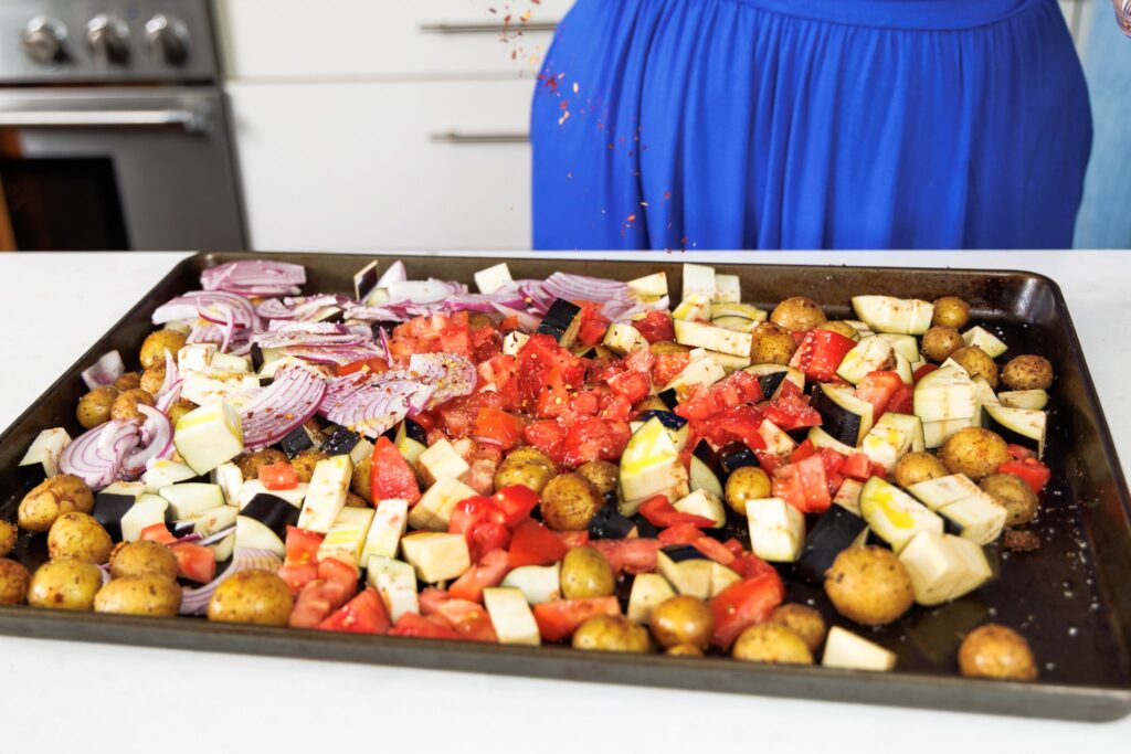 Step 2. Add the onion, eggplant, and tomatoes to the sheet pan with the potatoes. Make sure they’re all evenly coated in oil and seasoning before throwing back in the oven for another 15 minutes.