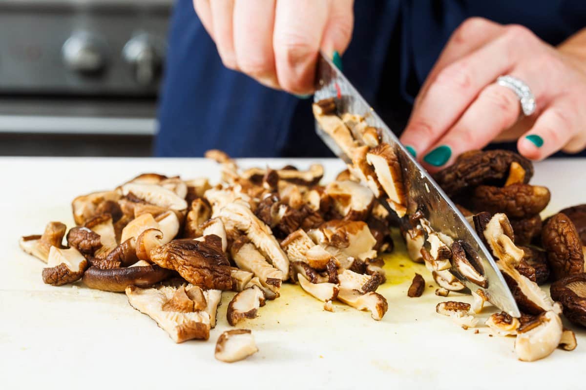 1. Place dried mushrooms in a medium bowl and cover with boiling water. Let steep to soften, about 15-20 minutes before straining, reserving 1 1/2 cups of the mushroom water. Roughly chop softened mushrooms and set aside.