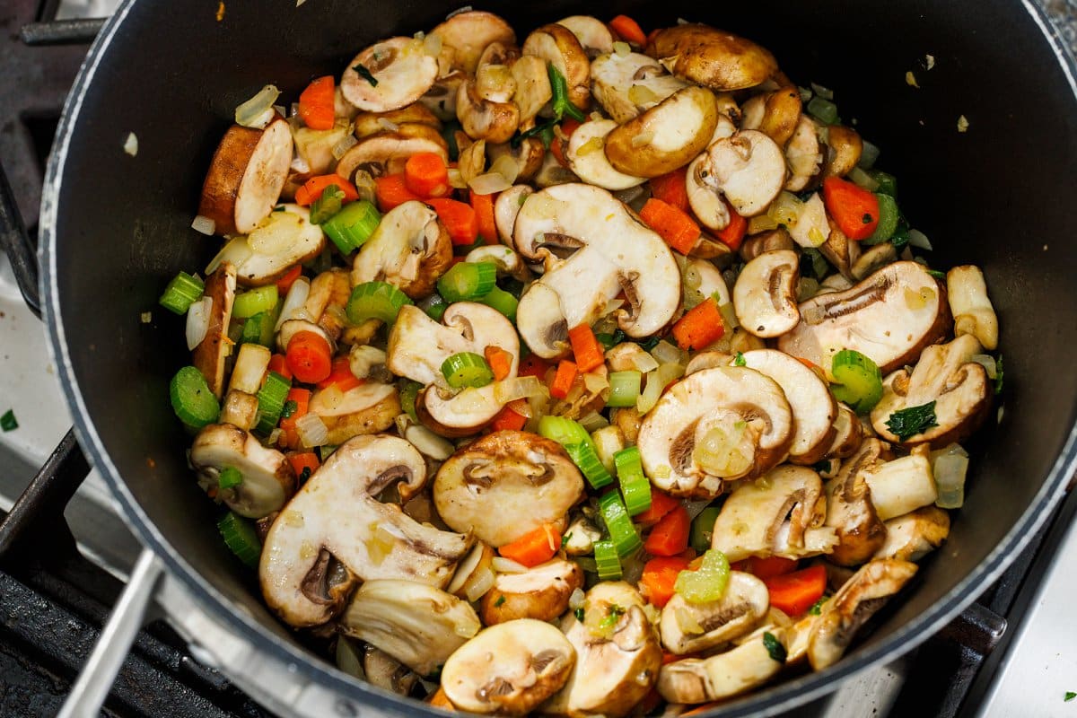 In the bottom of a large soup pot, heat the olive oil and add the diced veggies along with the sliced white mushrooms. Sprinkle with some salt and pepper, and sauté until vegetables have softened and begin to caramelize.