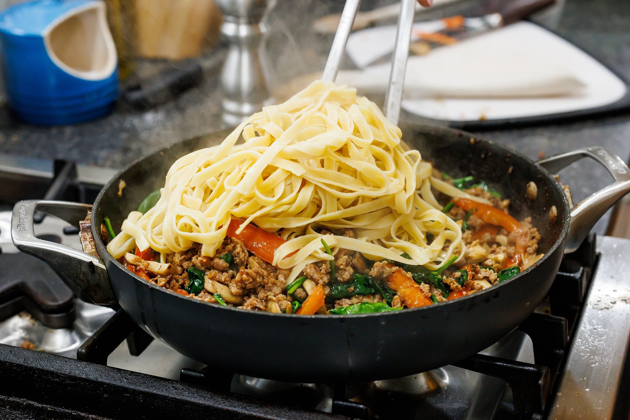 - Cook pasta noodles according to package directions and set aside, reserving 1/2 cup of the cooking pasta water.