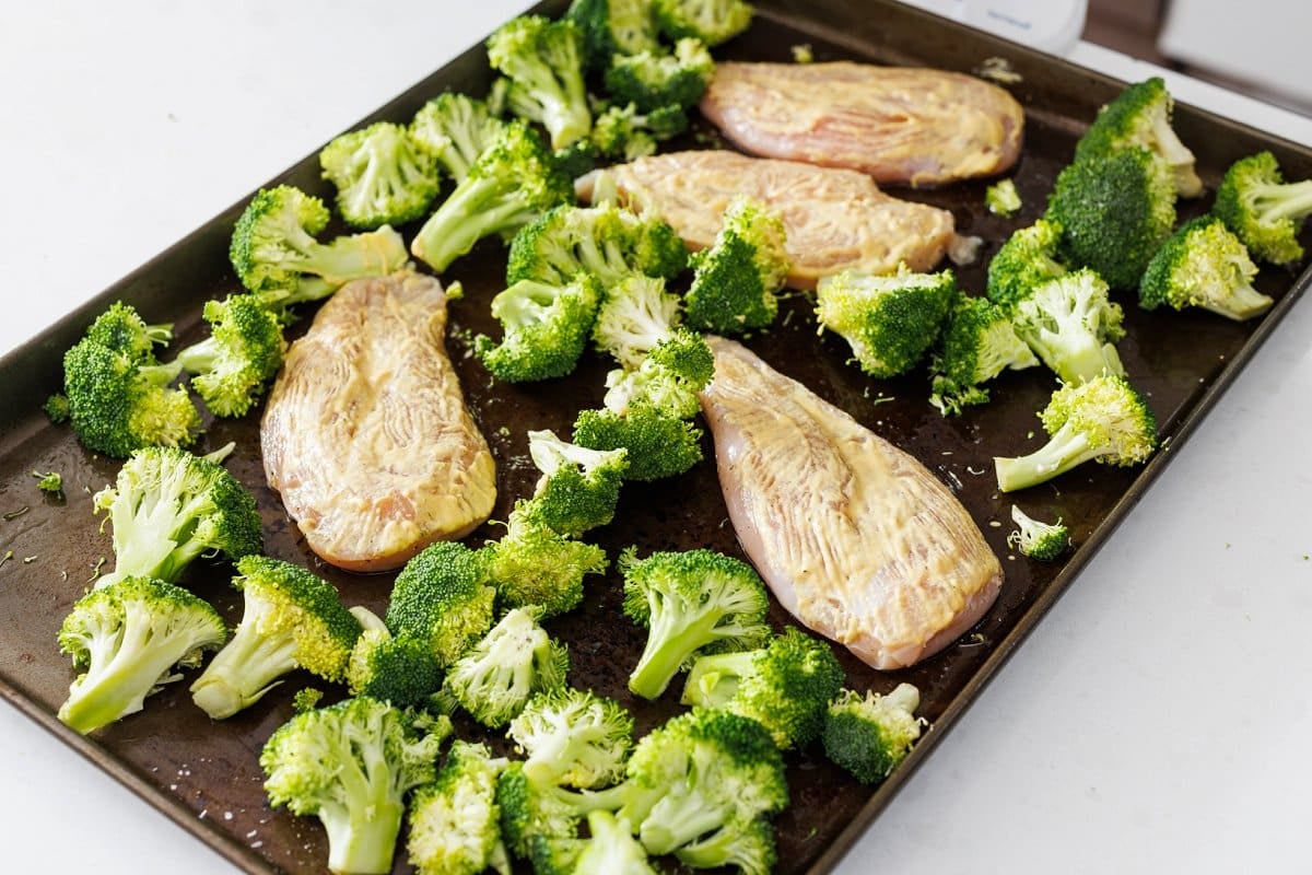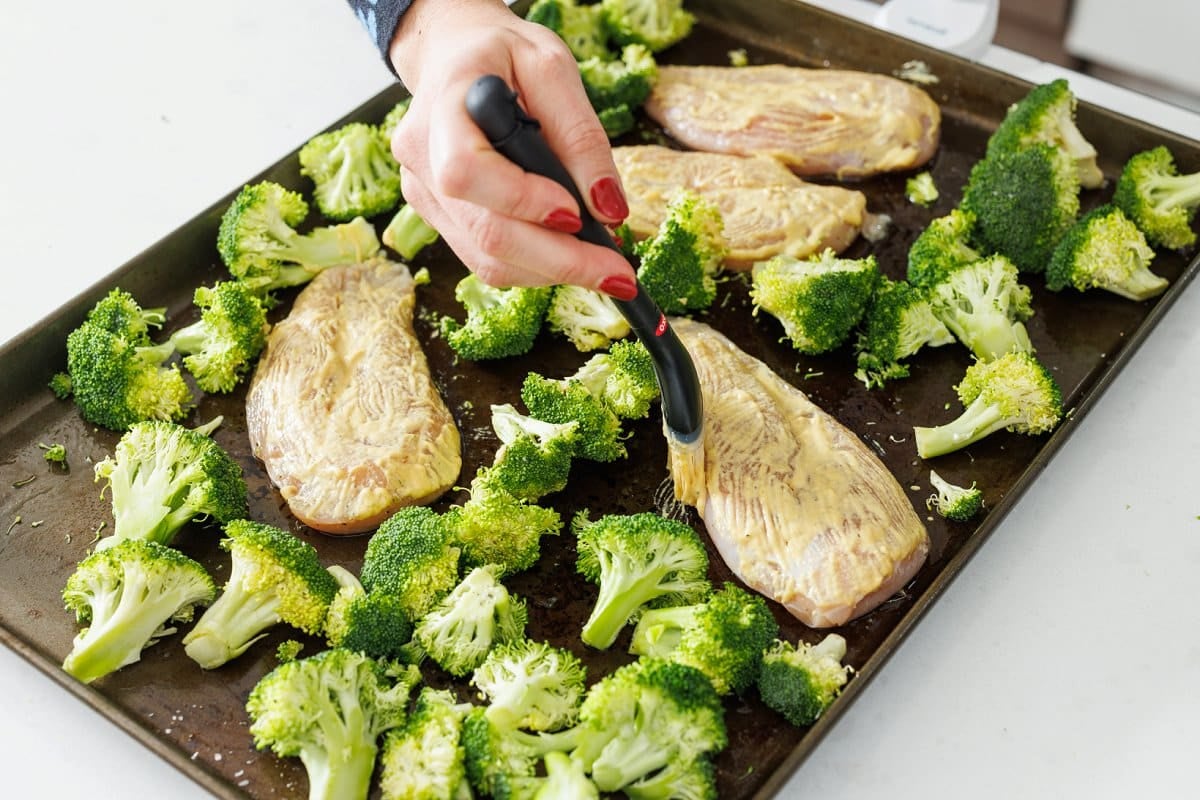 An easy one pan roasted chicken and broccoli dinner recipe made with boneless, skinless chicken breasts and brushed with Dijon mustard.