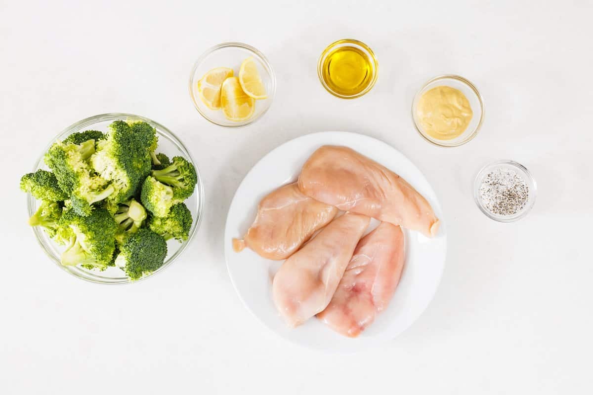 An easy one pan chicken dinner recipe, boneless, skinless chicken breasts are brushed with dijon mustard and roasted with broccoli.
