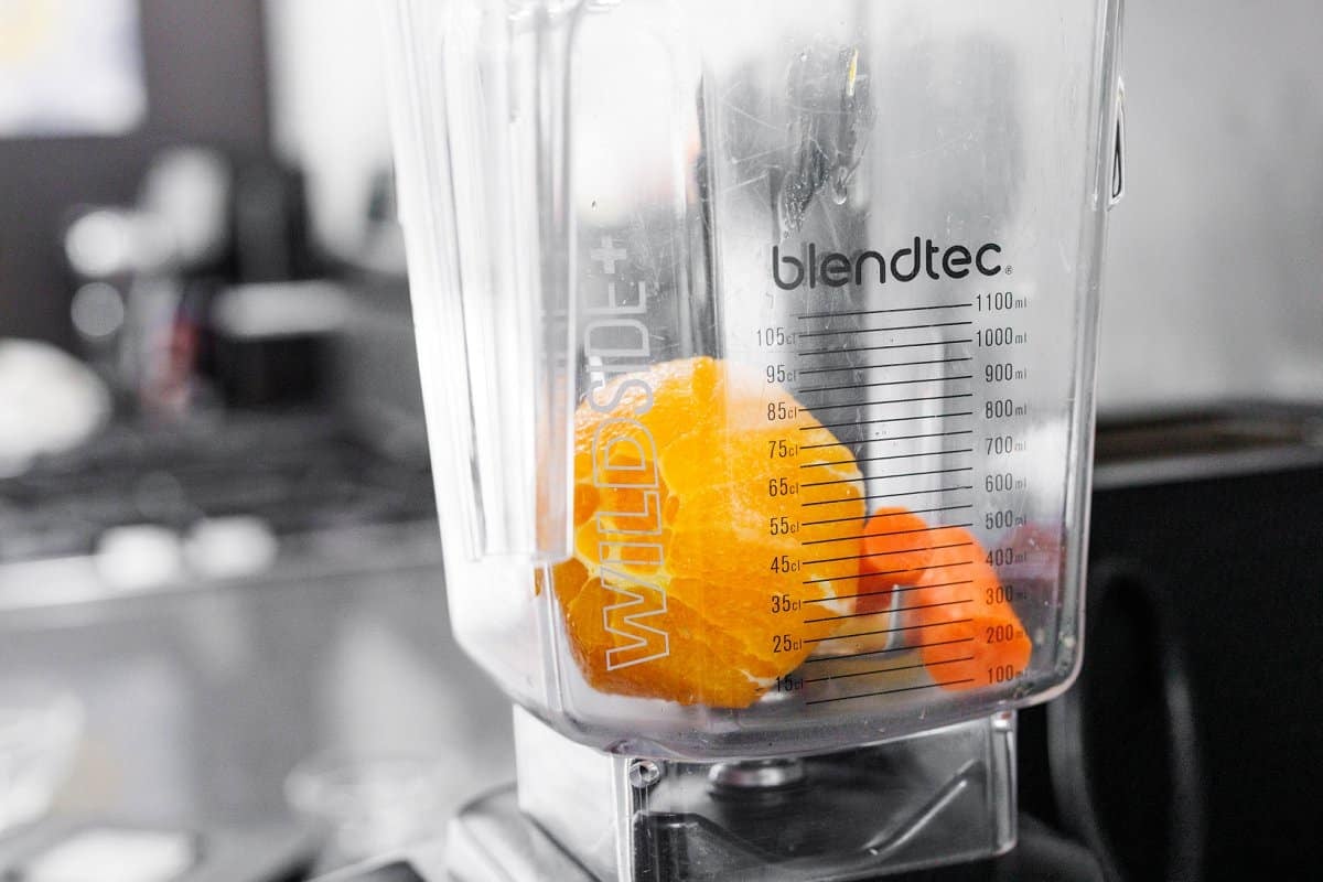Start your orange ginger detox smoothie by peeling the orange, peeling and chopping your carrots, and grating your ginger.