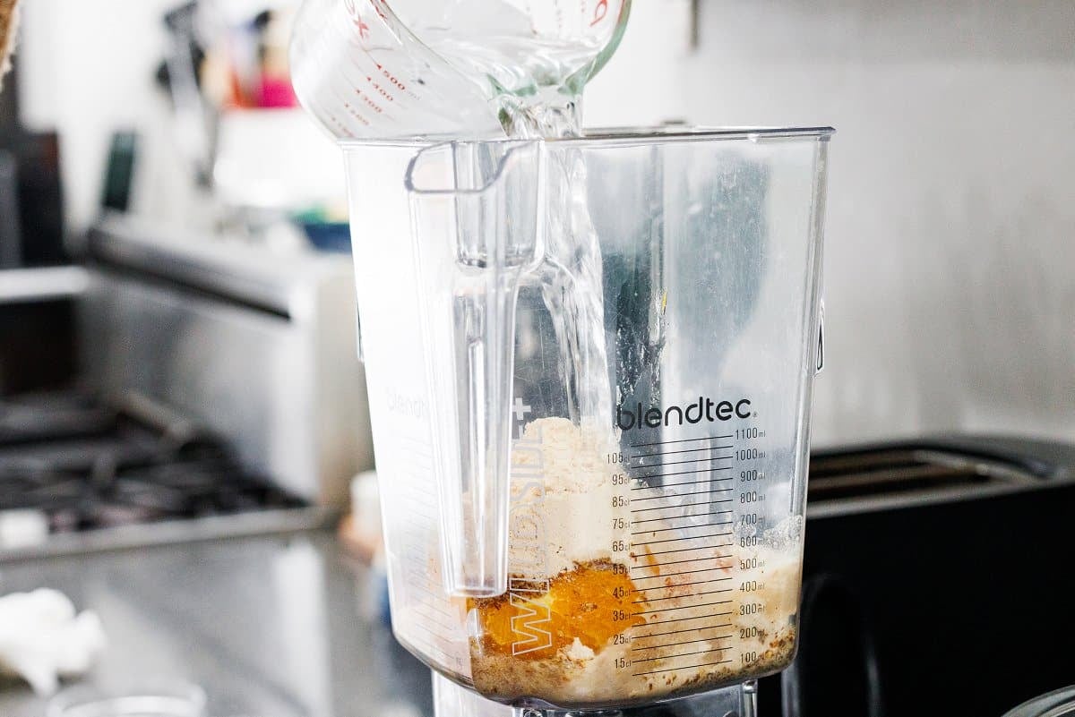 Then add the protein powder, flax seed meal, and lemon juice. Finish with some water and ice, then blend until smooth and it reaches your desired consistency.