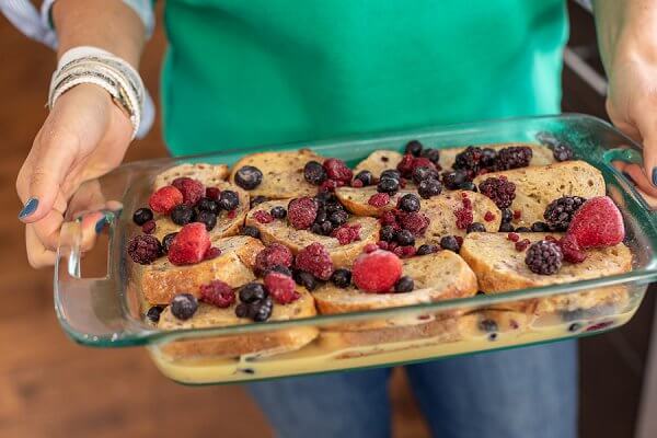 Next, you whisk together a mixture of eggs, milk, vanilla, and cinnamon. This custard will soak into the toast as it sits, ideally overnight but as little as two hours works too. Two layers of mixed berries are added to the pan in between layers of bread but you can also use bananas, peaches or any fruit you have on hand.