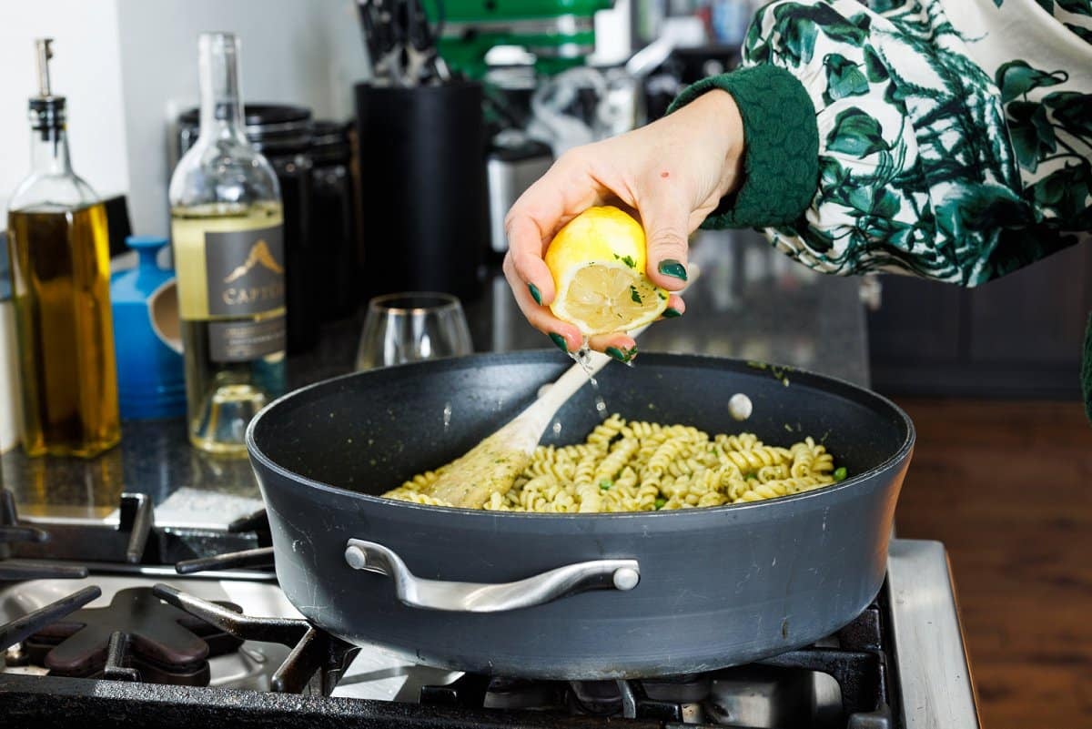 - Stir in cooked pasta, frozen peas and lemon juice. Toss well until evenly coated in pesto sauce. Season with salt and pepper to taste. If you need a bit more liquid, add in a little more starchy pasta water.