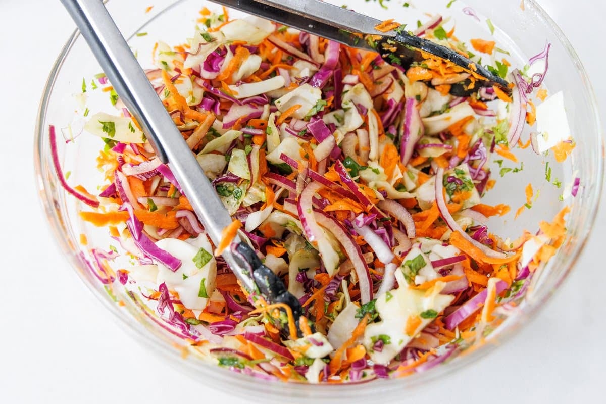 - Cabbage: I like to use a mix of red and green cabbage in my slaw.