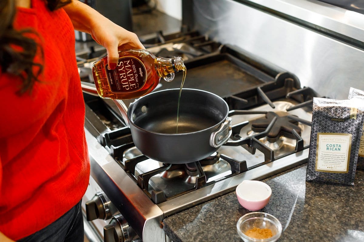 - While the coffee is brewing, whisk together pumpkin pie spice, maple syrup, vanilla and milk in a small sauce pot over medium heat. Continue whisking until bubbles start to form around the edges.
