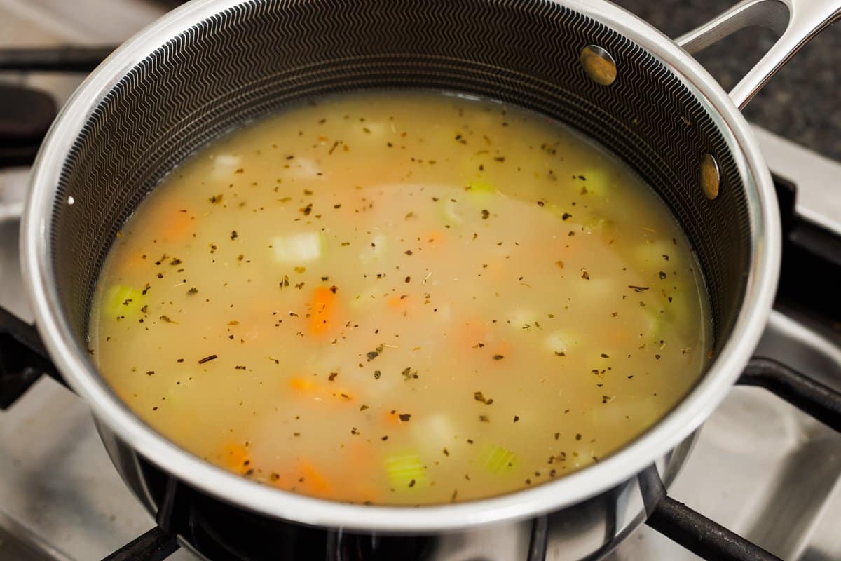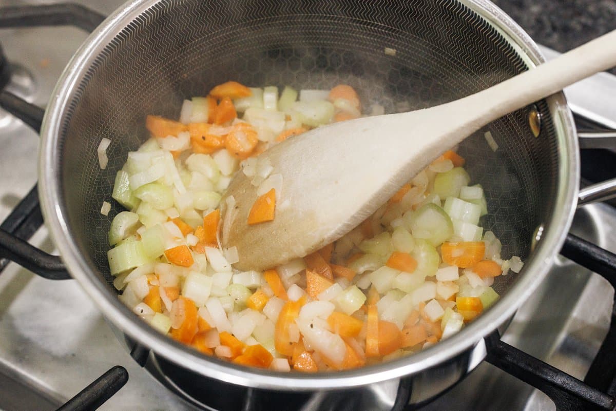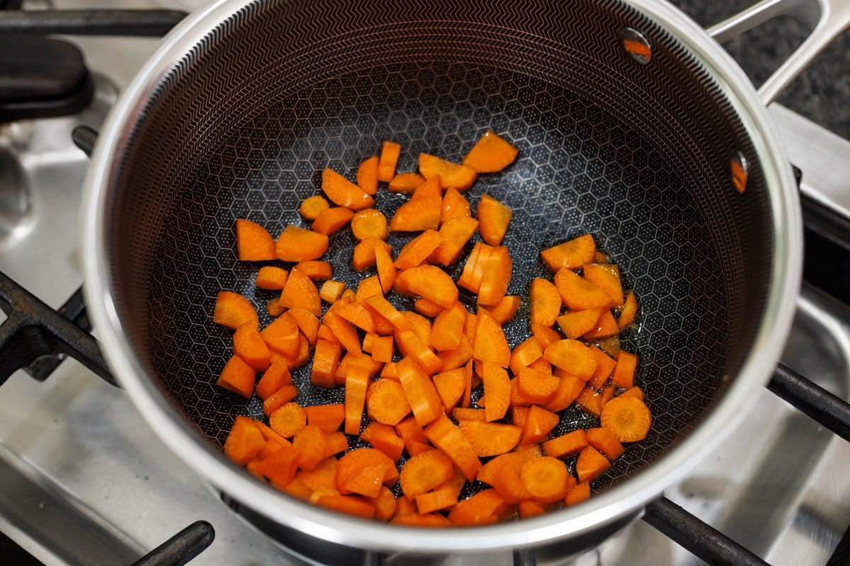 - Dry the saucepan, then heat it over medium heat and add oil. When oil begins to shimmer, add carrot, onion, and celery and cook until tender, about 4 minutes.