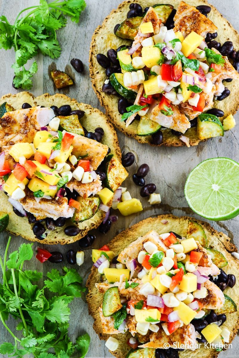 Blackened Salmon Tostadas with Mango Corn Salsa are a healthy dinner that comes together in under 20 minutes with under 350 calories.