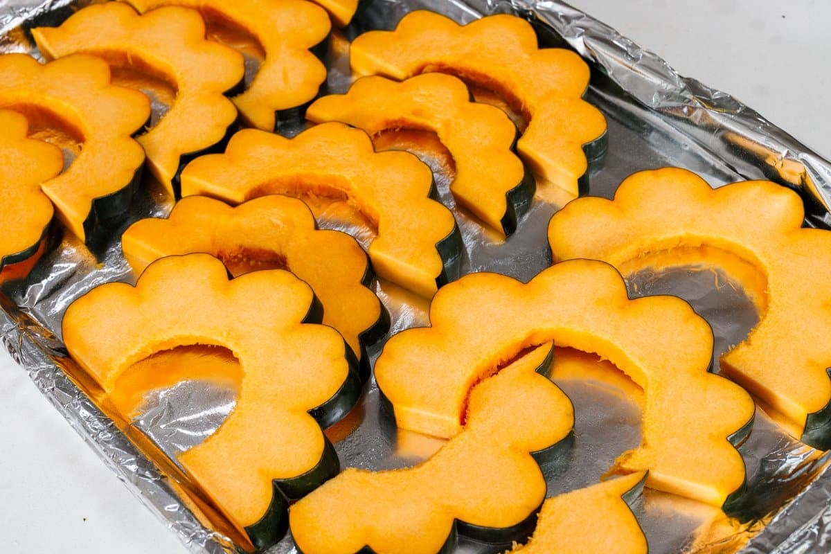 Start your roasted acorn squash with tahini sauce by taking your acorn squash and cutting it in half. Then cut off each end.