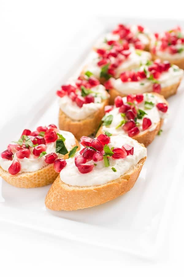 - To serve, spread each crostini with whipped feta and sprinkle with pomegranate seeds and minced parsley.