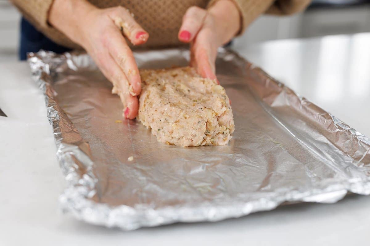 Then take your meat mixture and form a loaf on a prepared baking sheet lined with foil.