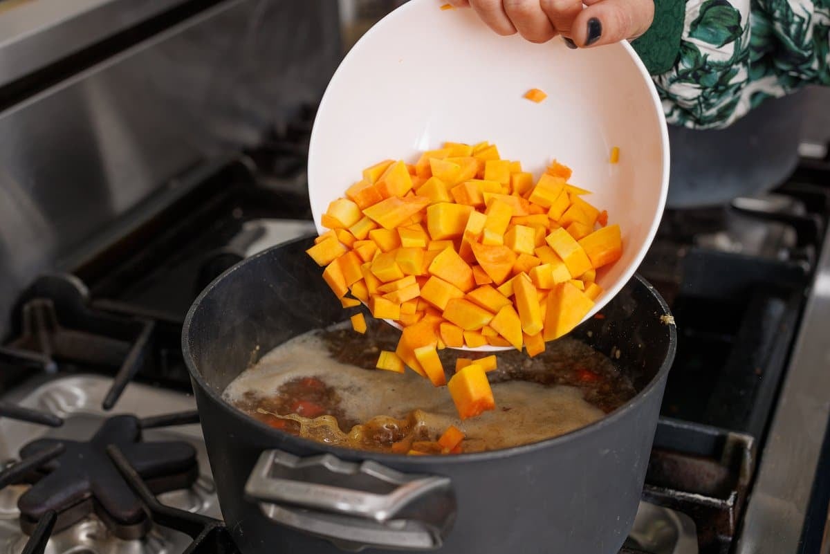 Step 8. Bring to a boil, then add in the butternut squash and simmer for about 10-15 minutes until squash is softened.