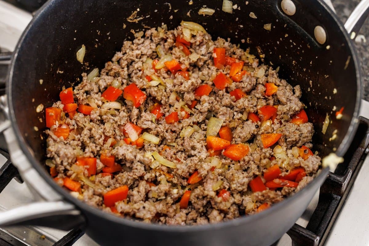 Step 3. In a large pot, drizzle some olive oil and heat to medium-high. Brown your sausage, breaking into pieces as it cooks.