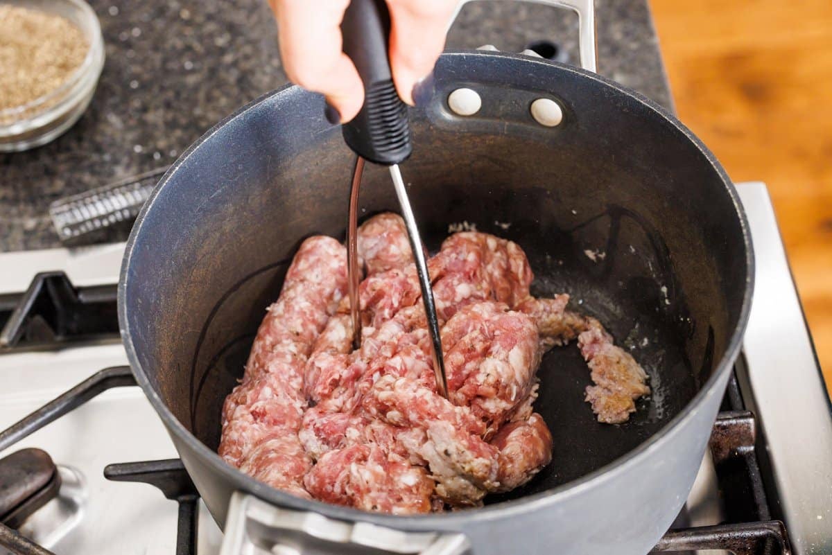 - Brown sausage for 7-8 minutes using a potato masher or wooden spoon to break into bite-sized pieces.