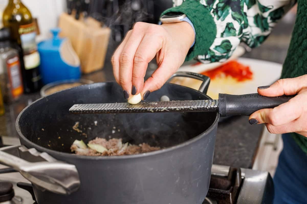 Step 4. Use a microplane to freshly grate your garlic in with the sausage.