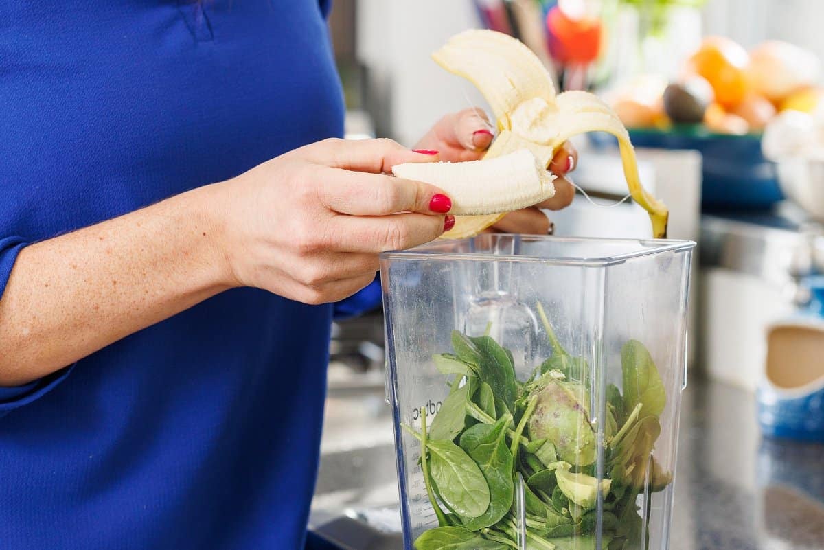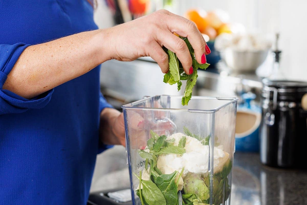 Start your shamrock shake by getting out your blender and adding the baby spinach.