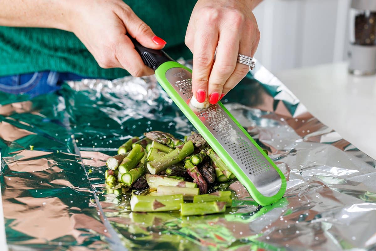 Once the lemon has been zested, juice the lemon onto the asparagus as well.