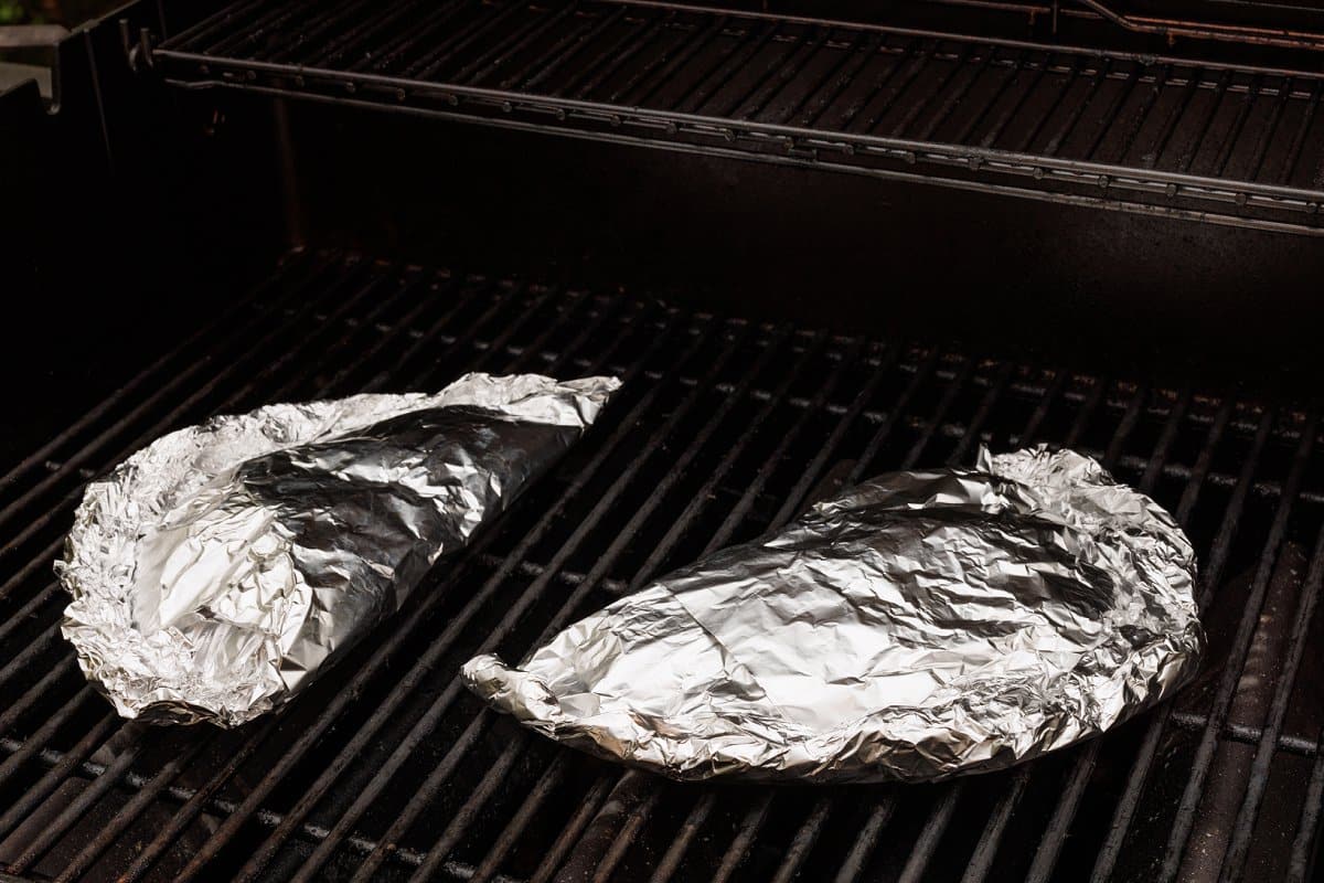 - Pre-heat grill over high heat. Tear out 8 12×12 pieces of tin foil. Place two pieces on top of one another, staggering a bit to create a little more space. Repeat three more times to create four foil sections which we will stuff and fold.