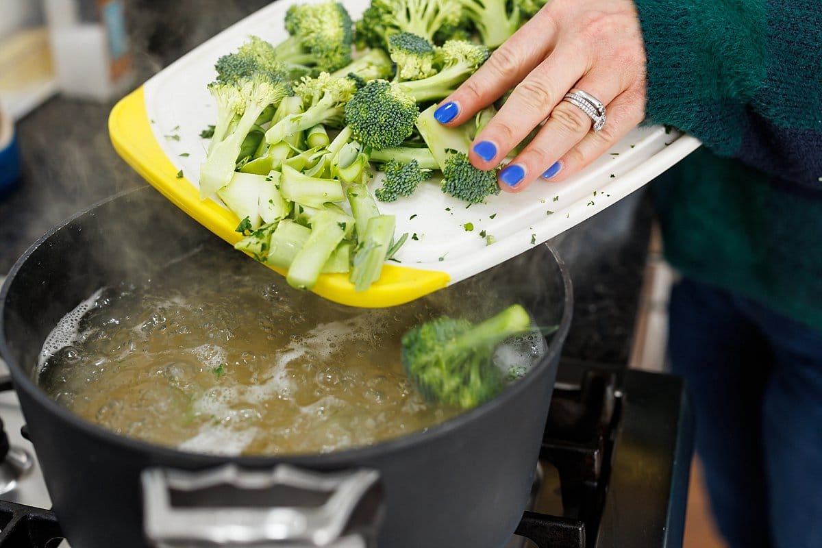 Start your shrimp and broccoli penne by washing and cutting your broccoli. You can use just the broccoli florets, but I love using the stalk as long as its cut into bite sized pieces.