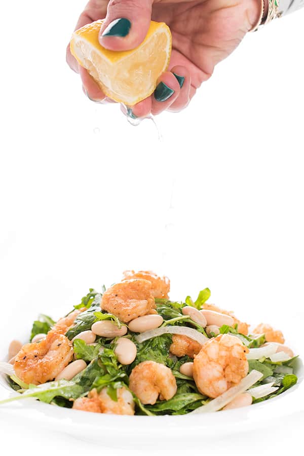 The dressing in this arugula salad with shrimp is nothing more than my favorite lemon vinaigrette made with lemon juice, olive oil, salt and pepper. You can always add in crushed garlic for more flavor but the shrimp is so delicious you won’t need it.