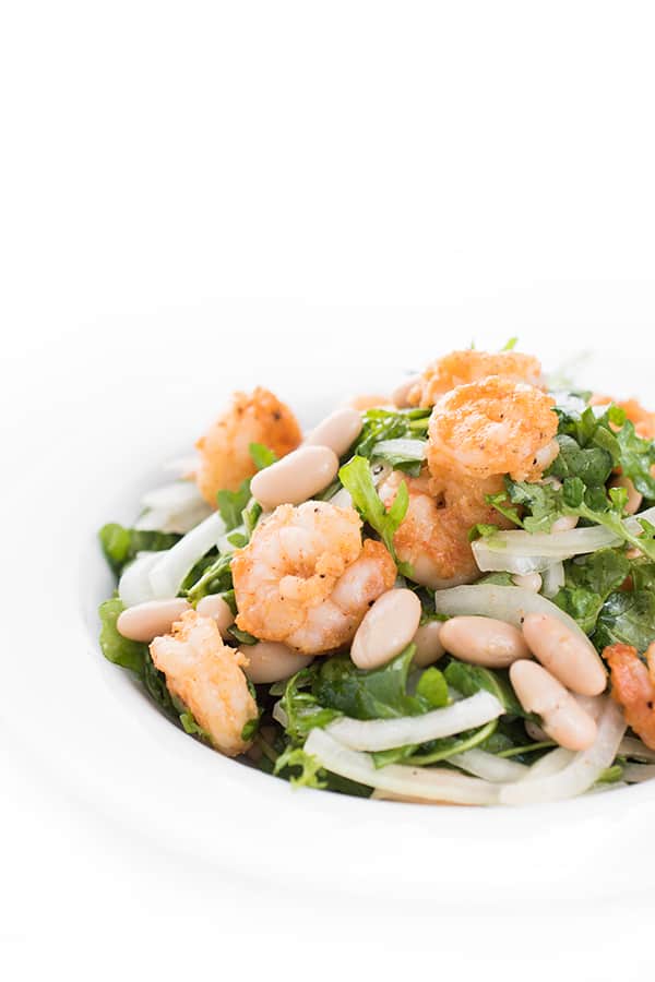 This fresh and flavorful arugula salad is topped with sautéed shrimp, sliced fennel and creamy white beans.
