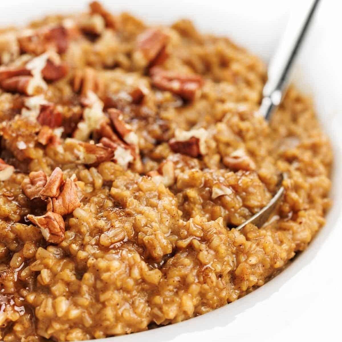 - In the morning, stir oatmeal with a fork to loosen the steel cut oats and make sure everything is fully incorporated. Serve warm with chopped pecans and additional brown sugar and molasses to taste.