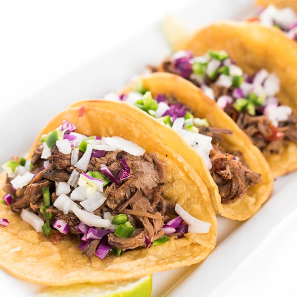 Beef is simmered with peppers, tomatoes, lime juice, cumin, garlic and other warm spices like cloves and allspice. When it’s done cooking I love to shred it and serve with warmed corn tortillas.
