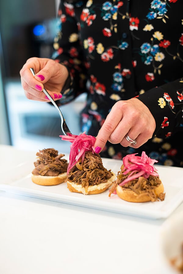 If you’re entertaining, both the pulled beef and the pickled red onions can be done at least one or two days ahead of time. This means you can relax and enjoy your guests instead of fussing over a hot grill or stove.