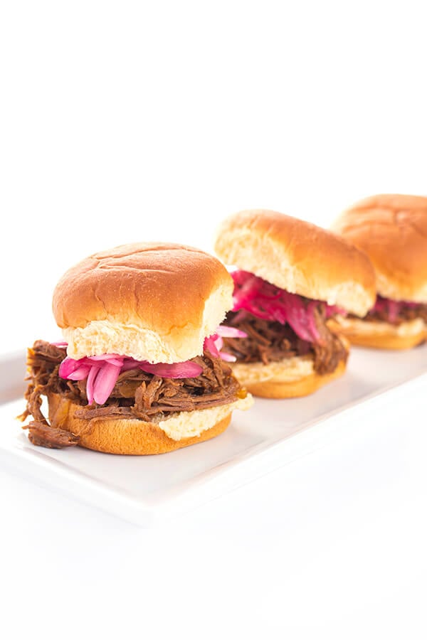 These sweet and smoky slow cooker shredded beef sliders are topped with tangy pickled red onions. The perfect recipe for entertaining a crowd!