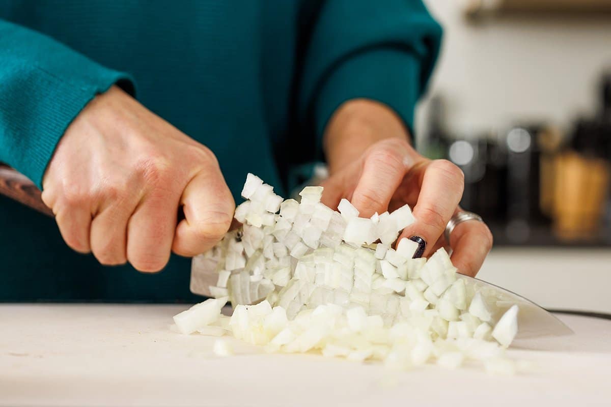 Start your Slow Cooker Vegetarian Chili by preparing all of your produce. Dice your onion, peel, deseed, and chop your butternut squash, and chop your adobo peppers.