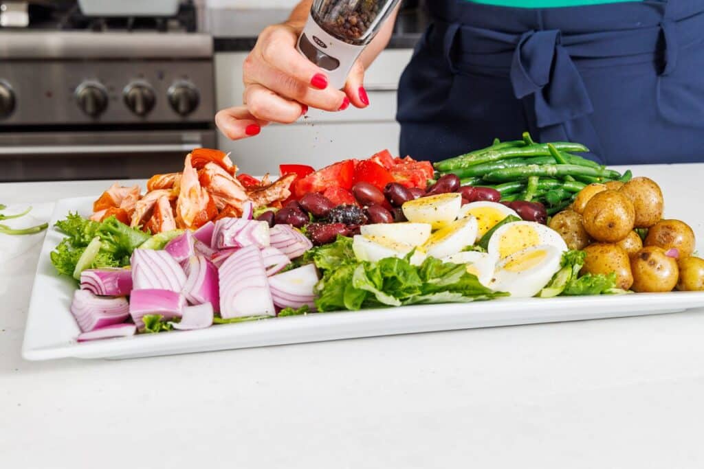 I’ve mentioned before how my mom was the queen of salads. We never had a meal without a fresh salad on the table such as her Syrian Salad, Tabbouleh Salad or Caribbean Salad with Banana. I like to try and follow in her footsteps by always serving a salad at our dinner table, but I like to shake things up from the classic Syrian Salad she usually served. If you are also looking for a new way to serve veggies to your family, then my Smoked Salmon Niçoise Salad is a perfect fit.