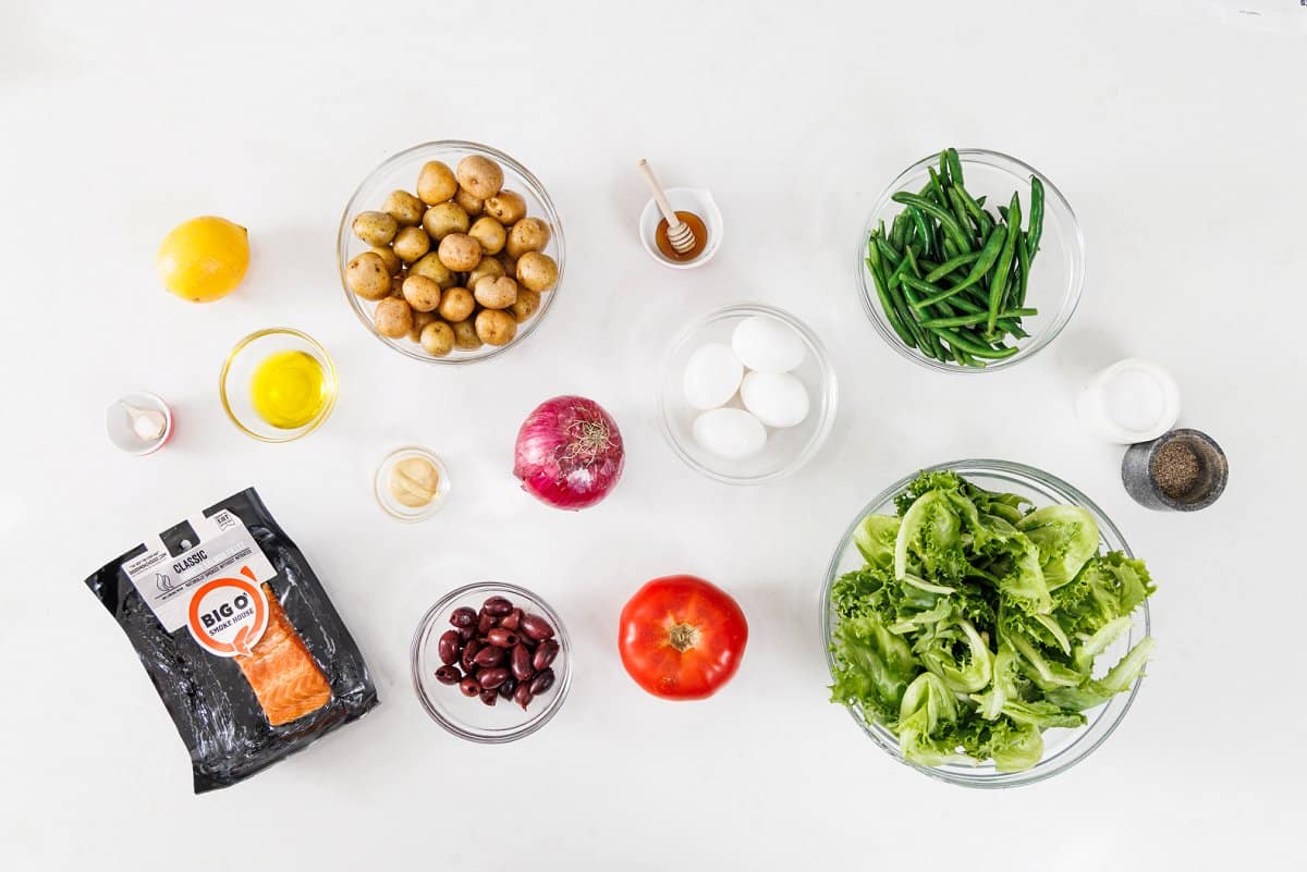 - Scatter arugula leaves on a large platter and top with prepared potatoes, flaked smoked salmon, eggs, tomato, red onion, kalamata olives and green beans.4 cups baby arugula, 4 large eggs, 1 cup cooked green beans, 1 large beefsteak tomato, 1/2 cup red onion, 24 kalamata olives, 8 ounces smoked salmon
