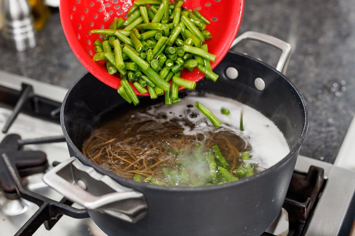1. Bring a large pot of salted water to boil and add soba noodles. Cook according to package instructions adding the green beans 2 minutes before the end of cooking time.