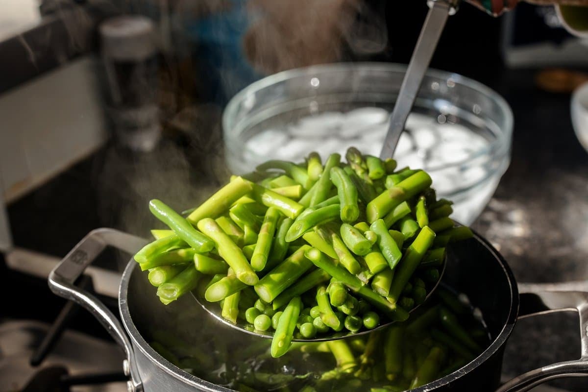 Step 2. Strain the noodles and green beans, rinsing with cold water to stop the cooking process. Set aside.