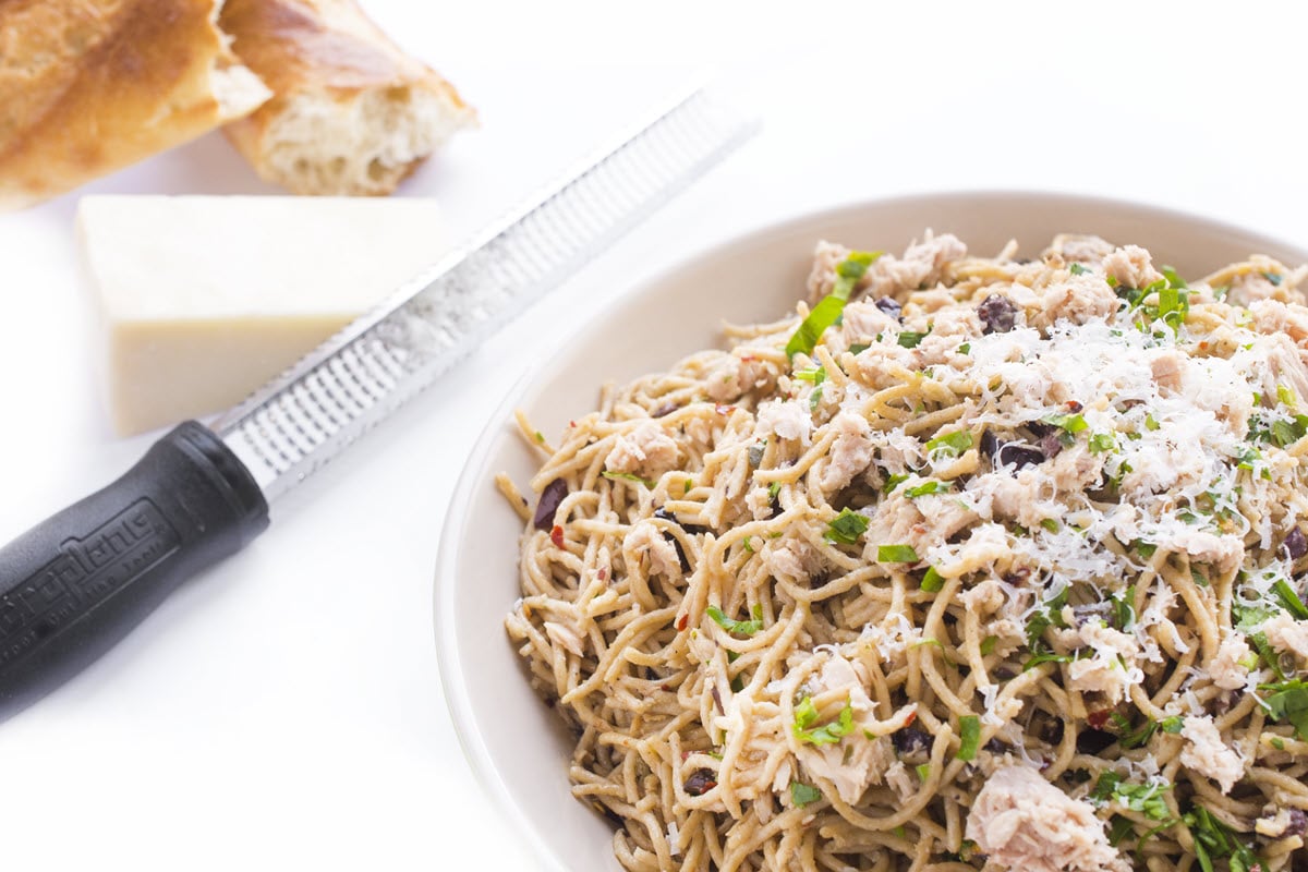 By combining a few high flavor pantry samples like briny capers, kalamata olives and tuna packed in olive oil, you are less than 15 minutes from a pasta dish that can be served warm, room temperature or chilled.