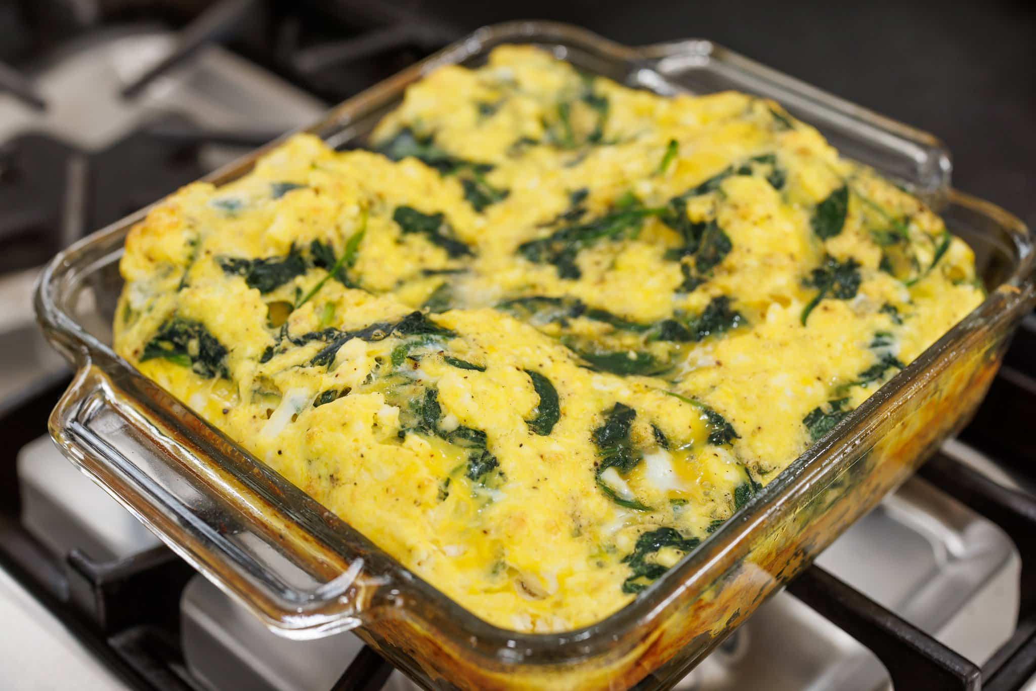 4. Bake in oven until eggs are fully cooked through, about 30-35 minutes. Slice pan into eight pieces to serve.