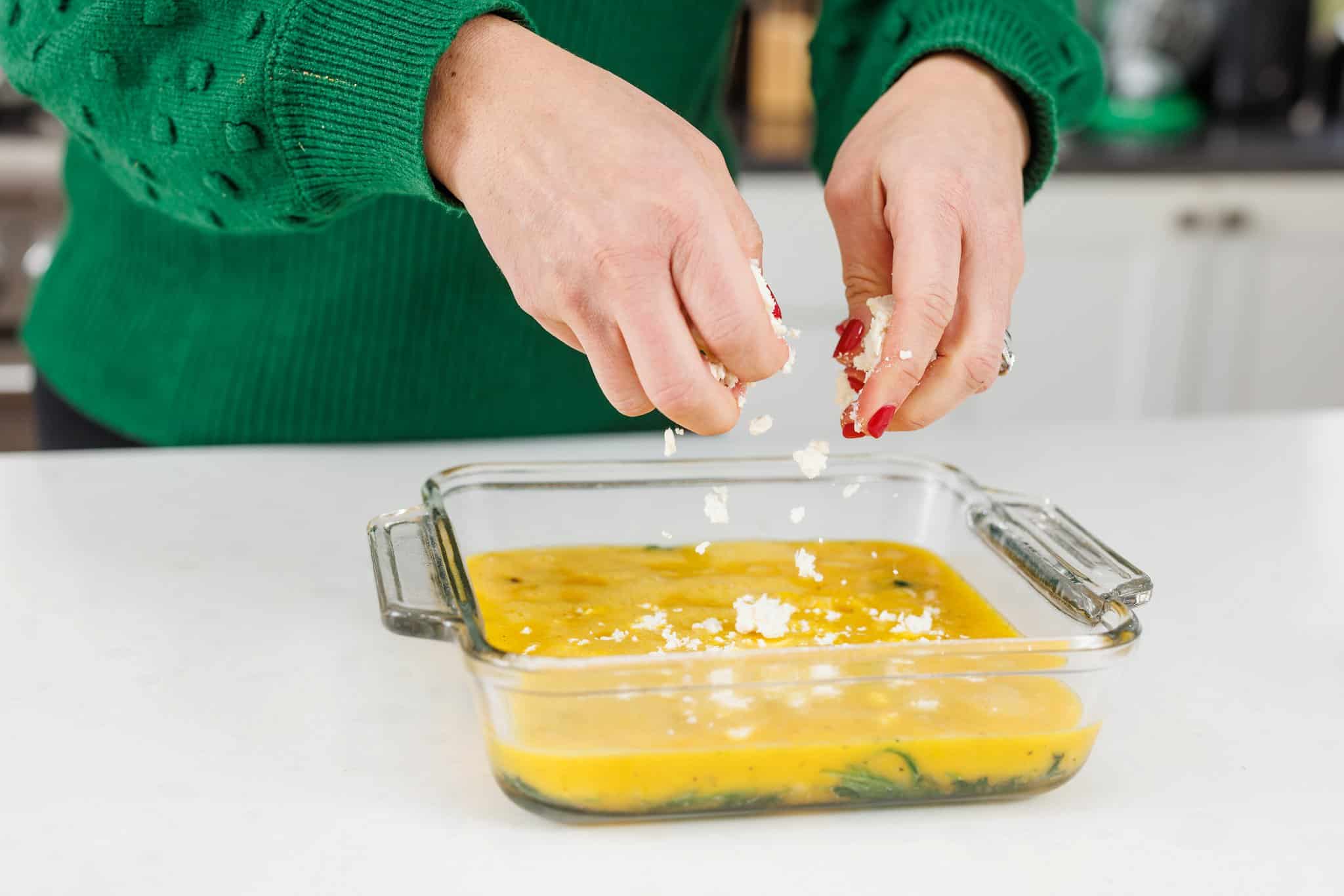 Sprinkle your crumbled feta cheese over the egg and spinach mixture, then use a fork to gently stir it all together.