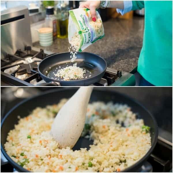 Keeping a bag or two stocked in your freezer is not only a huge time saver at dinner but it also cuts down on food waste since it is less perishable than fresh veggies. To cook the Riced Veggies, I simply drizzle a little olive oil in a hot pan and sauté until the cauliflower is fully warmed through and tender.