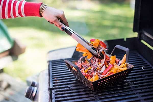 2. Toss peppers and onions with olive oil and salt then grill in a grilling basket until tender, about 15 minutes, stirring frequently; set aside.